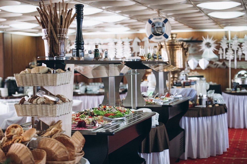 На борту теплохода гостей ждёт трёхразовое питание, включённое в стоимость круиза. Ресторан предлагает разнообразное меню по системе «шведский стол» с выбором вегетарианских и низкокалорийных блюд на завтрак, обед и ужин.